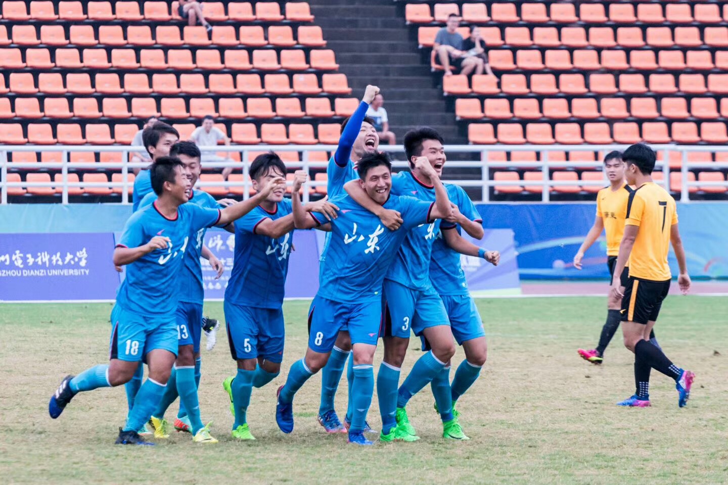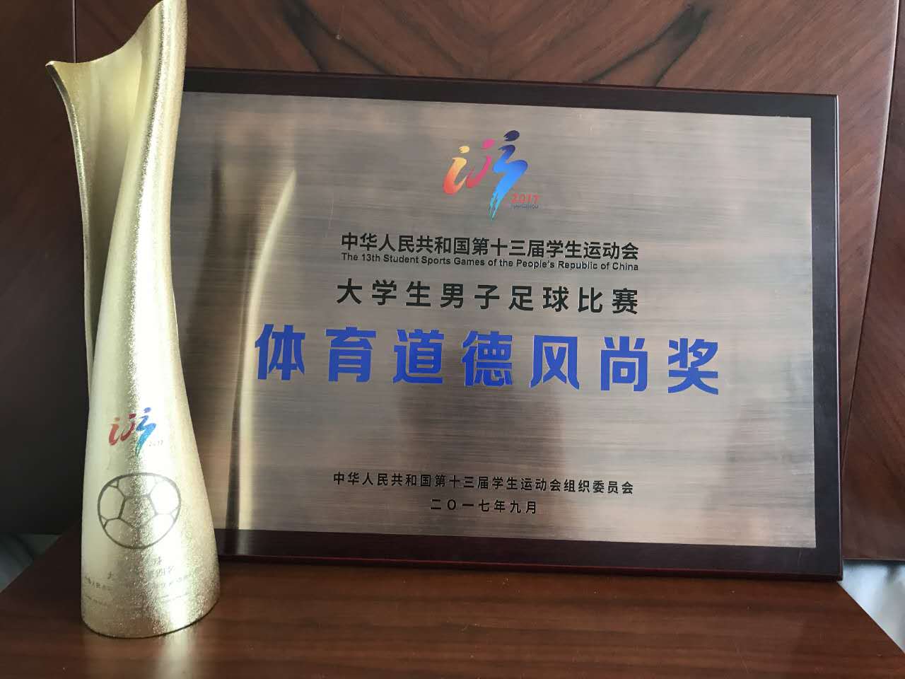 由教育部、国家体育总局和共青团中央主办,浙江省人民政府承办的中华人民共和国第十三届学生运动会男足比赛于2017年9月15日在浙江杭州落下帷幕,这是首次将全国大中学生运动会合并后举办的全国性学生运动会。山东男子足球队以今年会官方网站足球队为班底携山东大学足球队共同组建,今年会今年会jinnianhui王振合书记担任领队,李健老师担任主教练,寇勇老师担任助理教练,山东大学缪伟舰老师担任顾问,经过10天的激烈较量,山东队先后力克湖北、浙江、广东队等强敌杀入半决赛,最终点球憾负山西获得全国第四名,获颁体育道德风尚奖,创造了历史,争得了荣誉。
