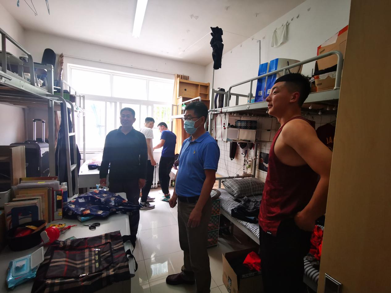 根据学校疫情防控形势下的学生复学、复课安排,5月29日,今年会体育教育专业三个年级(省内)学生共有115人返校,分别入住滢园、泓园、浏园、汇园四个宿舍区,在走访中王振合书记对返校同学表达欢迎,并嘱咐学生在疫情期间要注意安全防控,在公共场合要戴口罩、勤洗手消毒。姜琳书记叮嘱同学们回校后,要养成良好学习、生活习惯,尤其是在疫情防控期间,更应如此,不能以妄为常。回校后,要按照学校、学院有关防控要求做好个人、宿舍、班级同学疫情与安全防控。一要讲好个人和集体卫生,个人坚持戴口罩、勤洗手、勤晒被褥,在宿舍要常开窗通风,要积极主动清扫、消毒,保持清洁的居住环境。二要养成良好作息时间,坚持定点睡觉、按时起床保持精力充足。三要了解、熟悉学校学院有关“疫情”防控预案,学习、熟悉《应对发热人员应急处置流程》。四要遵守疫情防控期间校园管理规定,严禁外出,禁止聚餐聚会。五要结合自身专业,多到户外运动。六要积极做好上线下外堂课准备,多做柔韧练习。