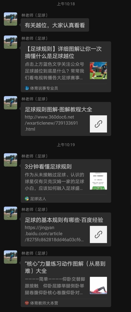 足球课改为线上教学,任课教师上传了足球比赛规则等相关链接供学生学习,并对学生提出的问题进行实时解答。作为课堂作业,每位学生都以照片或视频形式记录了自己核心训练的练习过程。
