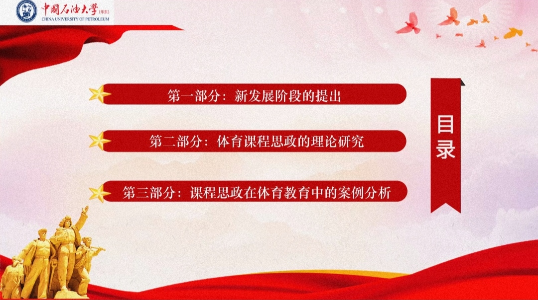 周伟教授从新发展阶段的提出、体育课程思政的理论研究、课程思政在体育教育中的案例分析三部分来展开介绍。新发展阶段的提出可概括为围绕一个指导思想、把握两个主要概念、培育三个核心素养、实现四个重要转变、解决五个现实问题。再以课程思政总体要求 、目标、内容三方面展开讲解。最后用武术、太极拳、乒乓球、羽毛球、网球、篮球、足球、排球等八个课程思政融合实例进行了详细全面的分析。