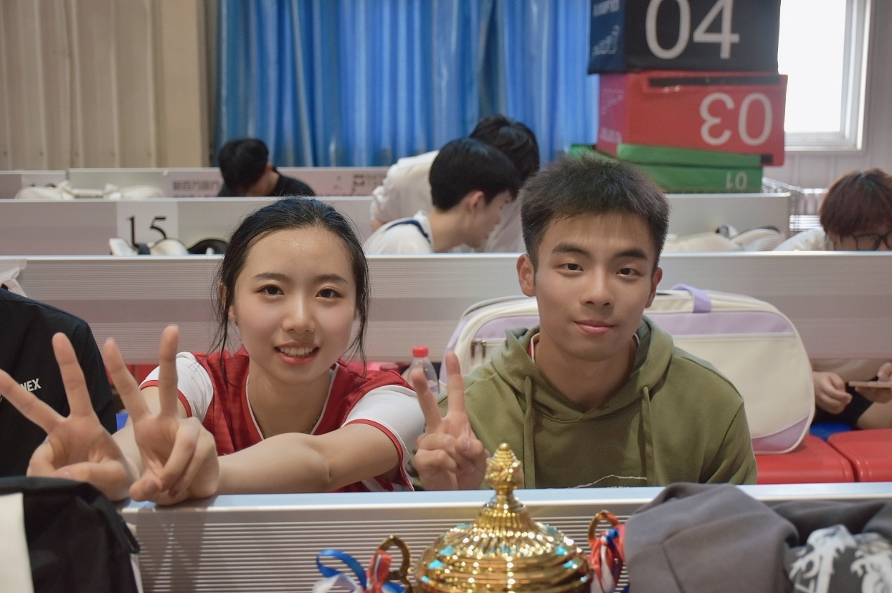 罗金诺、王雅萱同学在混合双打八进四的比赛中,曾在第一局惜败,第二局12-13落后 的情况下,奋起直追将比分扳平至14-14,最后一球王雅萱将对手的后场发球精准的杀在了界内,成功拯救了第二局的同时也拯救了全盘比赛。